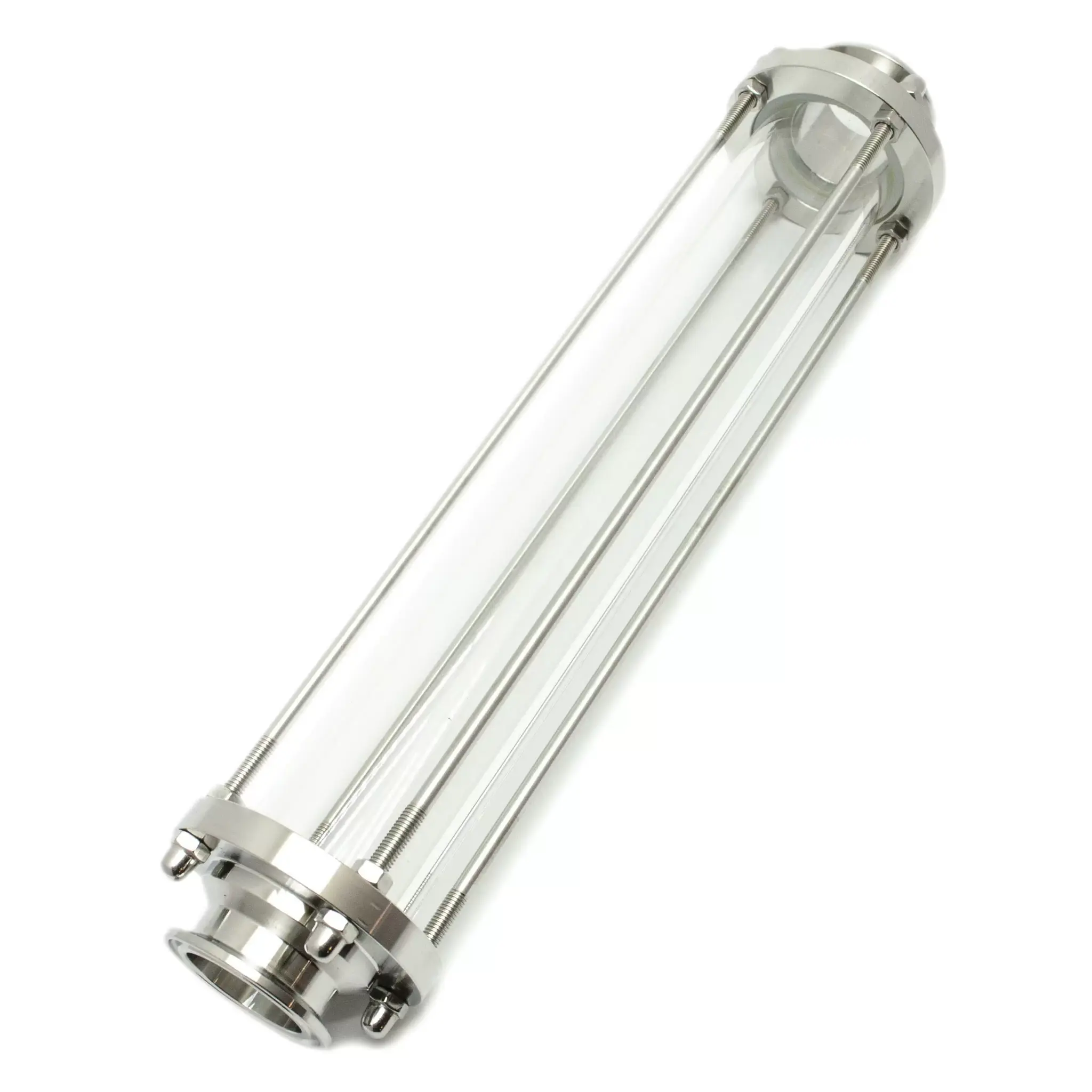 Диоптр смотровой 2 дюйма для самогонного аппарата - удобное приспособление для визуального контроля приготовления дистиллята в домашних условиях. Необходимо для понимания того, как интенсивно кипит брага и как испаряются пары спирта. Имеет кламповые установочные соединения размером 2 дюйма, для модернизации аппаратов, имеющих аналогичные установочные соединения. Устанавливается диоптр после перегонного куба и до холодильника. Внутрь диоптра смотрового высокого (500 мм) можно разместить насадки РПН или СПН - медную или стальную, она сильно повышает очистку дистиллята при перегоне, а через кварцевое стекло диоптра виден сам процесс перегонки и прохождения паров спирта через плотную сетку Панченкова.