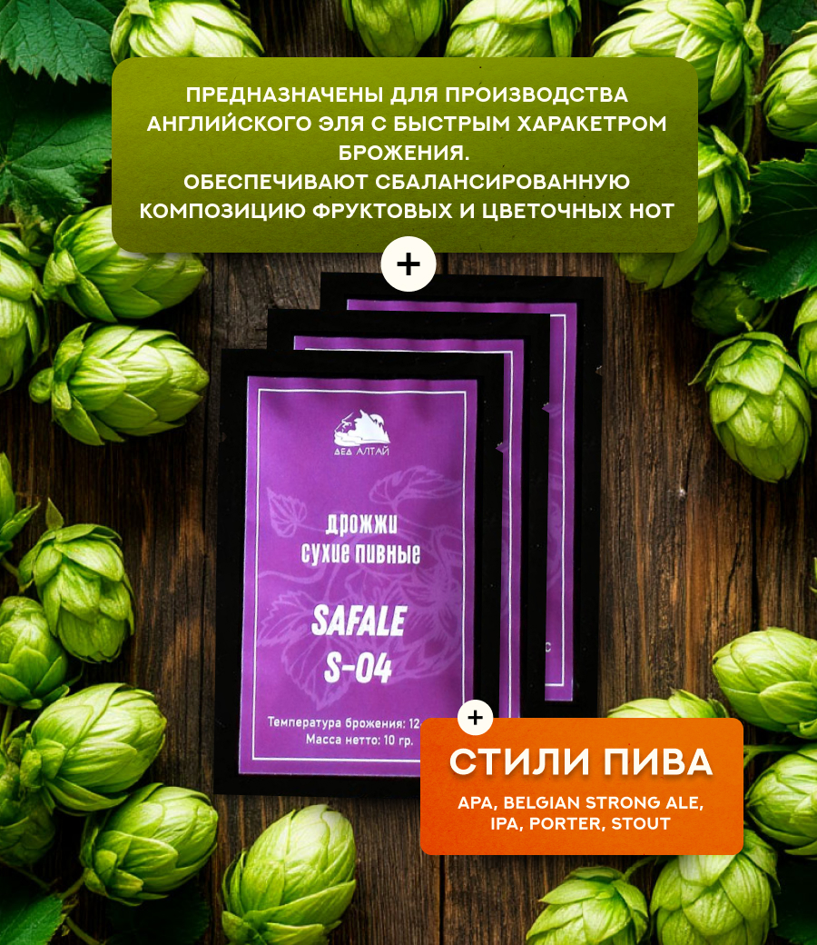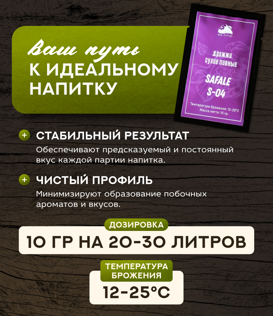 Дрожжи SAFALE S-04 отобраны благодаря своей быстрой кинетике брожения и своей способности образовывать плотный осадок в конце процесса брожения, улучшая таким образом осветление пива.