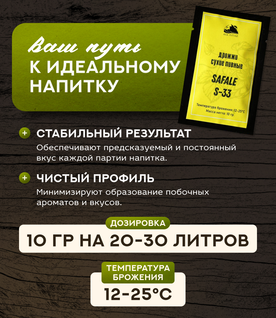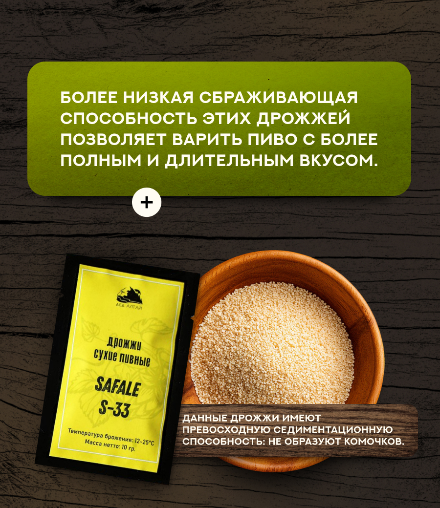 SAFALE S-33 устойчивые дрожжи с нейтральным ароматическим профилем. Низкая сбраживающая способность позволяет варить пиво с более длительным вкусовым букетом. Они особенно рекомендованы для специальных элей и пива типа Траппист.