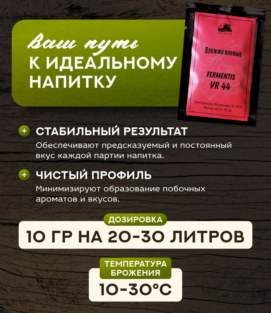 - Красные вина: Учитывая характеристики ферментации, VR 44 позволяет производить марочные красные вина, изысканные, чистые и с характерными чертами терруара (Каберне Совиньон, Мерло, Карменер. Барбера, Санджовезе, Терольдего...).