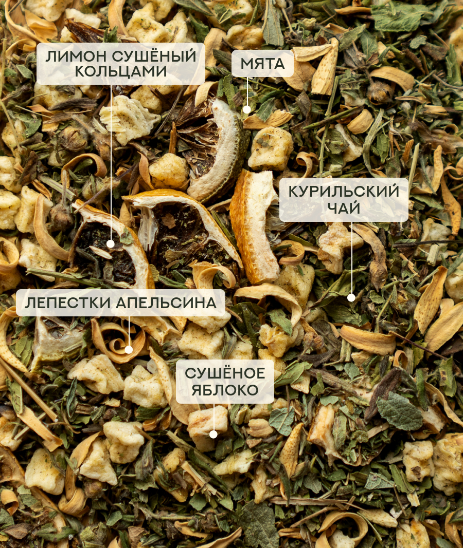 Состав:курильский чай, мята, яблоко сушеное кубик, лимон сушеный долькой, лепестки апельсина.