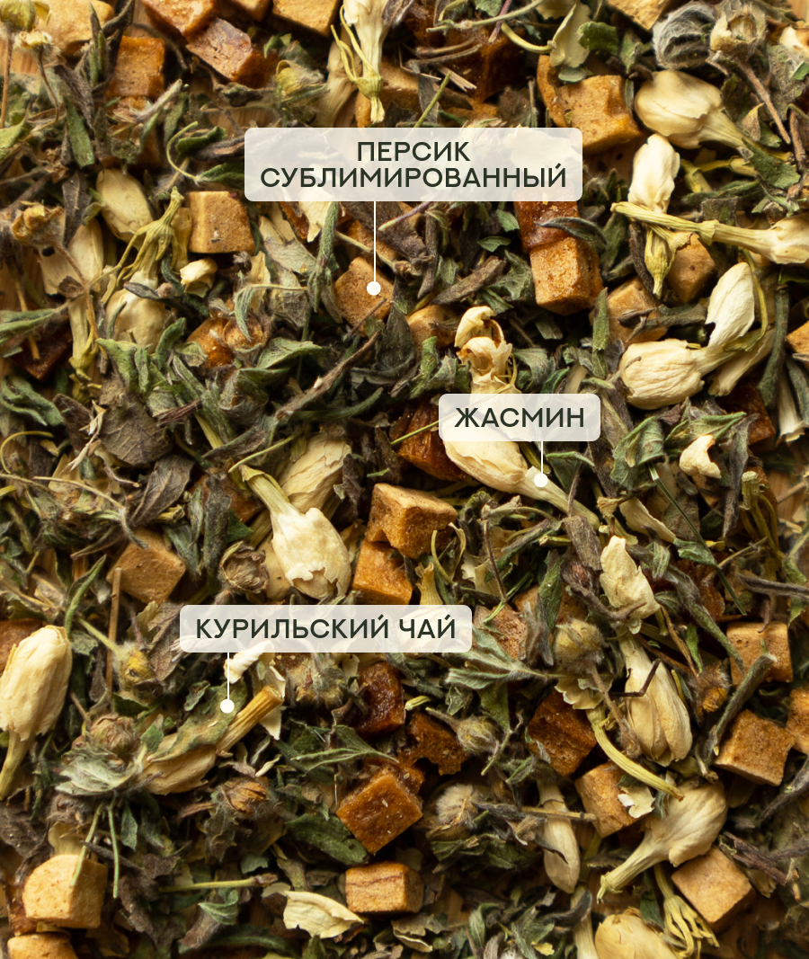 В основе — курильский чай, дополненный ароматным жасмином и кусочками персика, высушенного методом сублимации. Лёгкий, бархатистый напиток с тонким сладким послевкусием и свежими нотами жасмина.