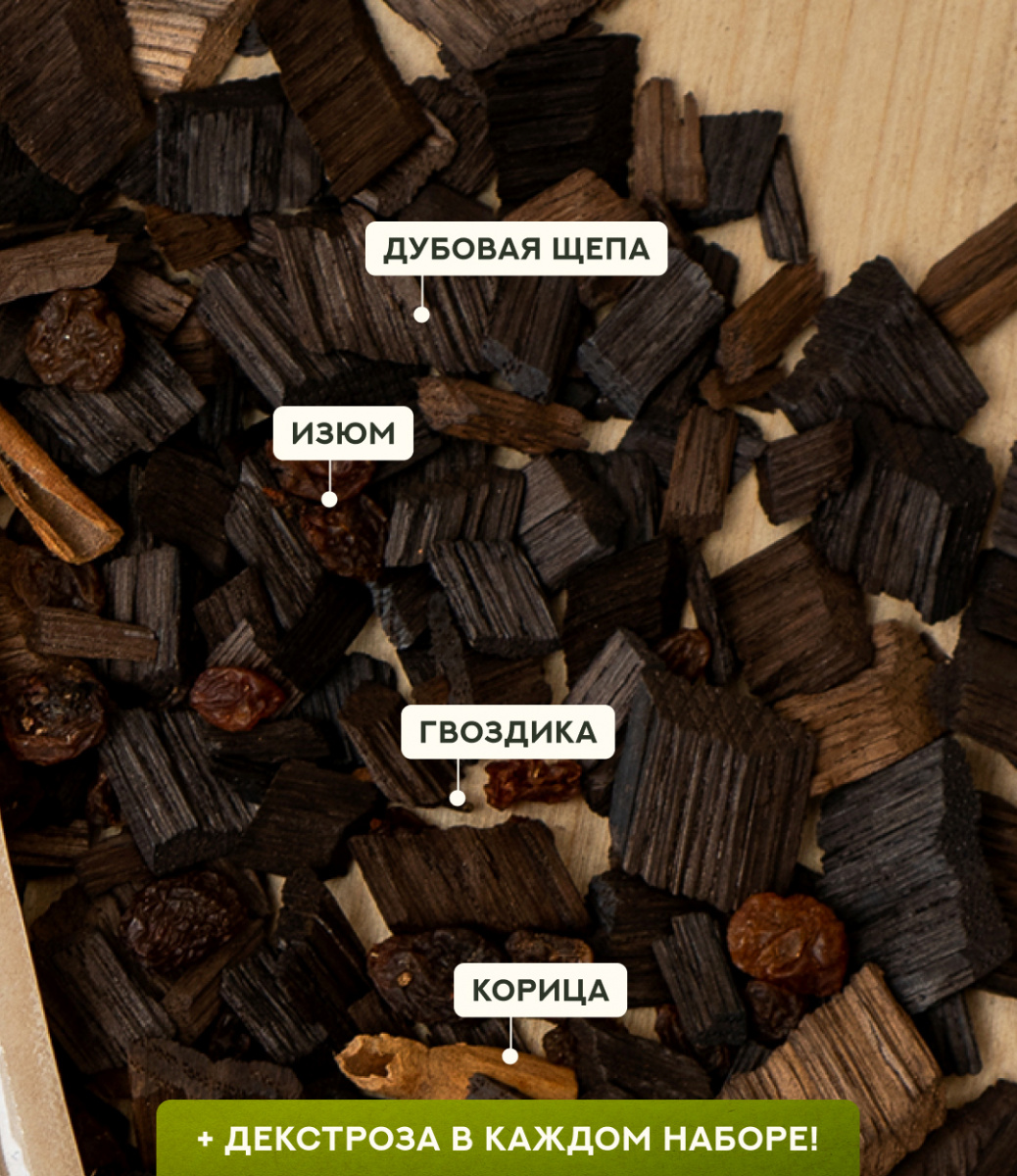 Состав:дубовая щепа, изюм, корица, гвоздика, декстроза.