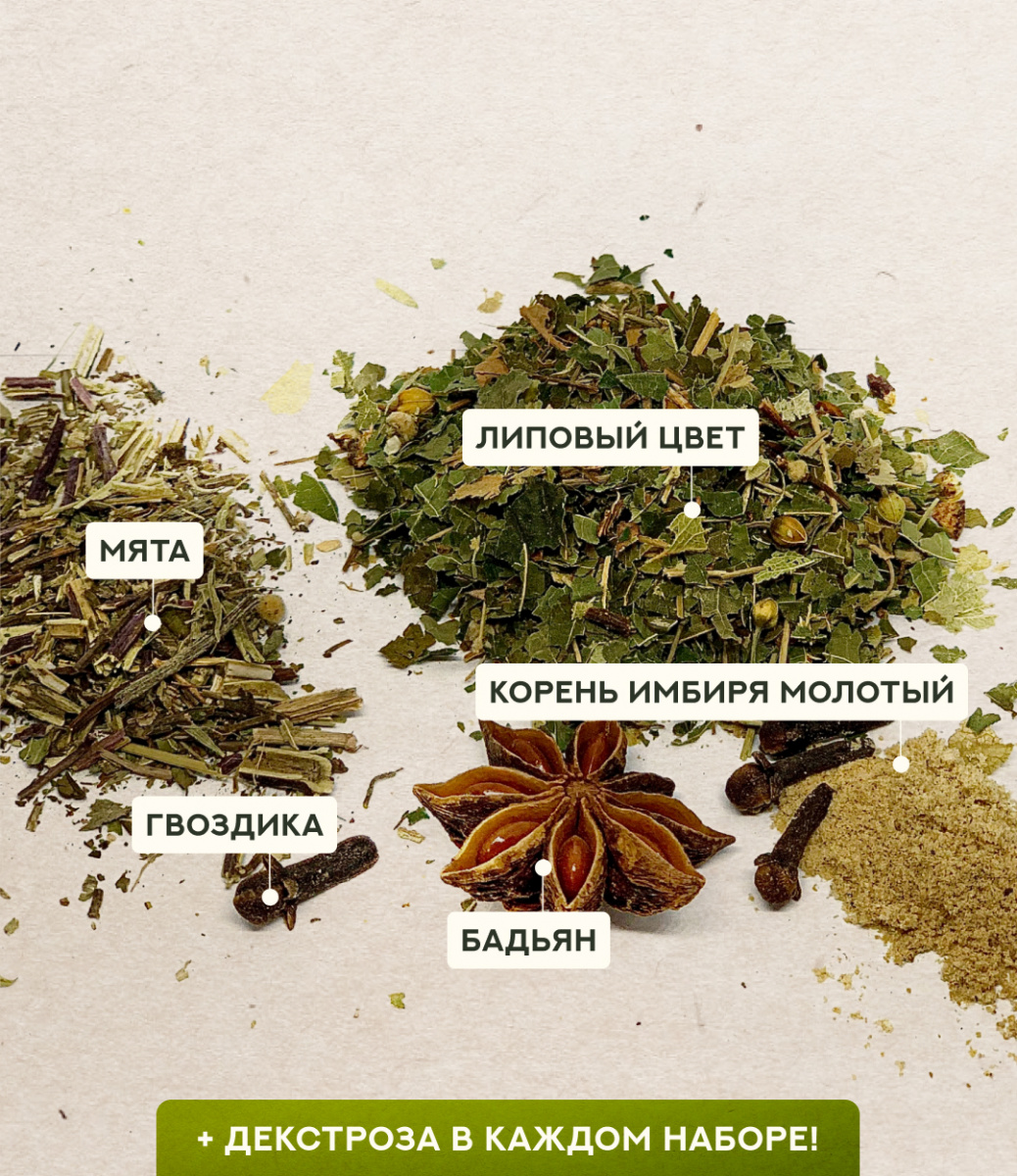 Состав:липовый цвет, корень имбиря молотый, мята, бадьян, гвоздика, декстроза.