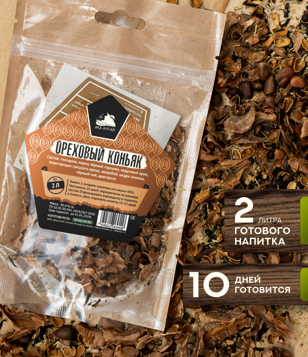 Состав:гвоздика, перец чёрный горошек, кедровый орех, перегородки грецкого ореха, зверобой, цедра лимона, чёрный чай, декстроза.
