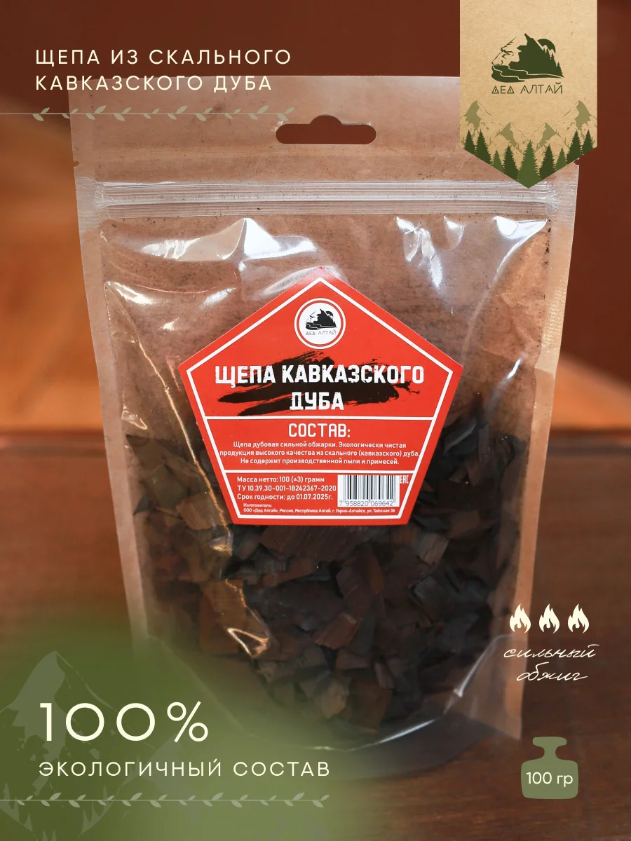 Состав:щепа дубовая сильной обжарки. Экологически чистая продукция высокого качества из скального (кавказского) дуба. Не содержит производственной пыли и примесей.